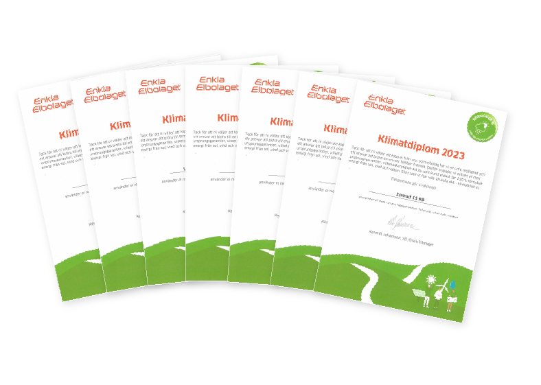 LENY använder klimatklok el från sol, vind, vatten och biobränsle. Här följer våra diplom från 2023: